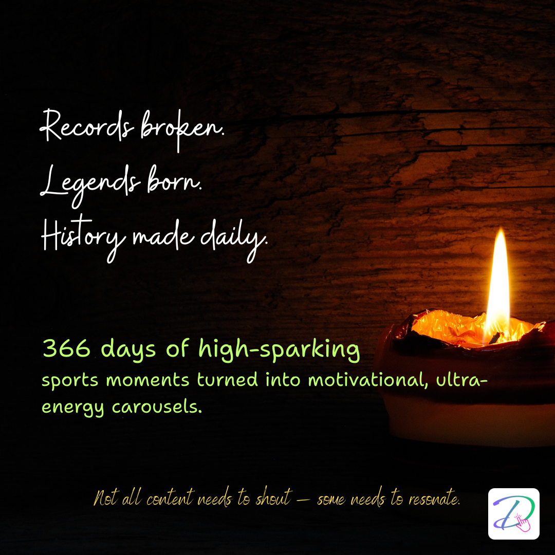 Score massive wins with our electrifying “366 Days of Victory” carousel pack, a champion white-label contender with limited Private Label Rights (PLR). Jam-packed with 366 powerhouse carousels (daily motivation, leap year triumphs) and 2,196 adrenaline-rushing slides, each one celebrates 6 epic achievements in sports, including championships, records, debuts, and legendary performances.